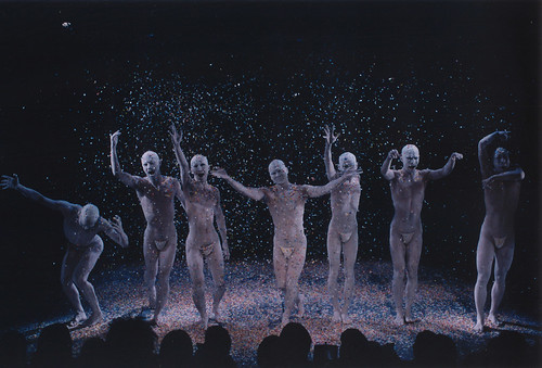 Ocho varones japoneses en el escenario bajo una lluvia (radioactiva?) de confetis. Casi desnudos y empolvados, una estética inspirada en los supervivientes de Hiroshima y Nagasaki, muertos vivientes de cuerpos abrasados y ojos en blanco. Afeminados movimientos y grititos. Se cortarán el pene en un ritual en el que el espanto cede a la hilaridad; viajarán castrados por tierra de nadie; recuperarán finalmente su pequeña identidad y hasta la mostrarán al pblico sin los taparrabos mínimos ni los ocultamientos entre los muslos con que se mortifican durante buena parte del espectáculo.